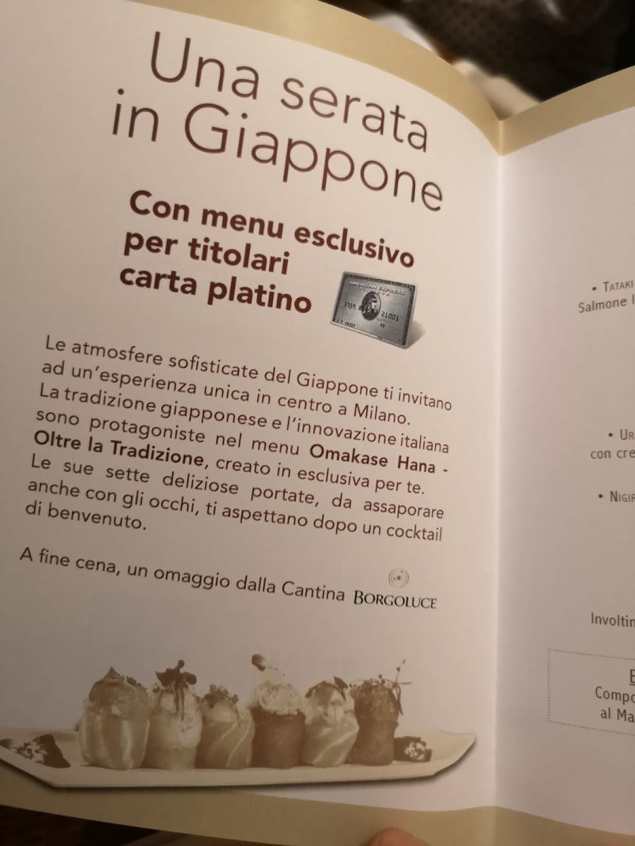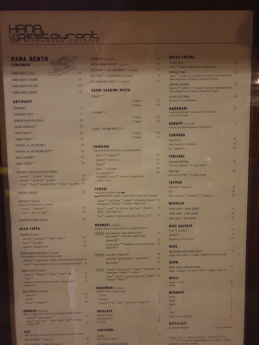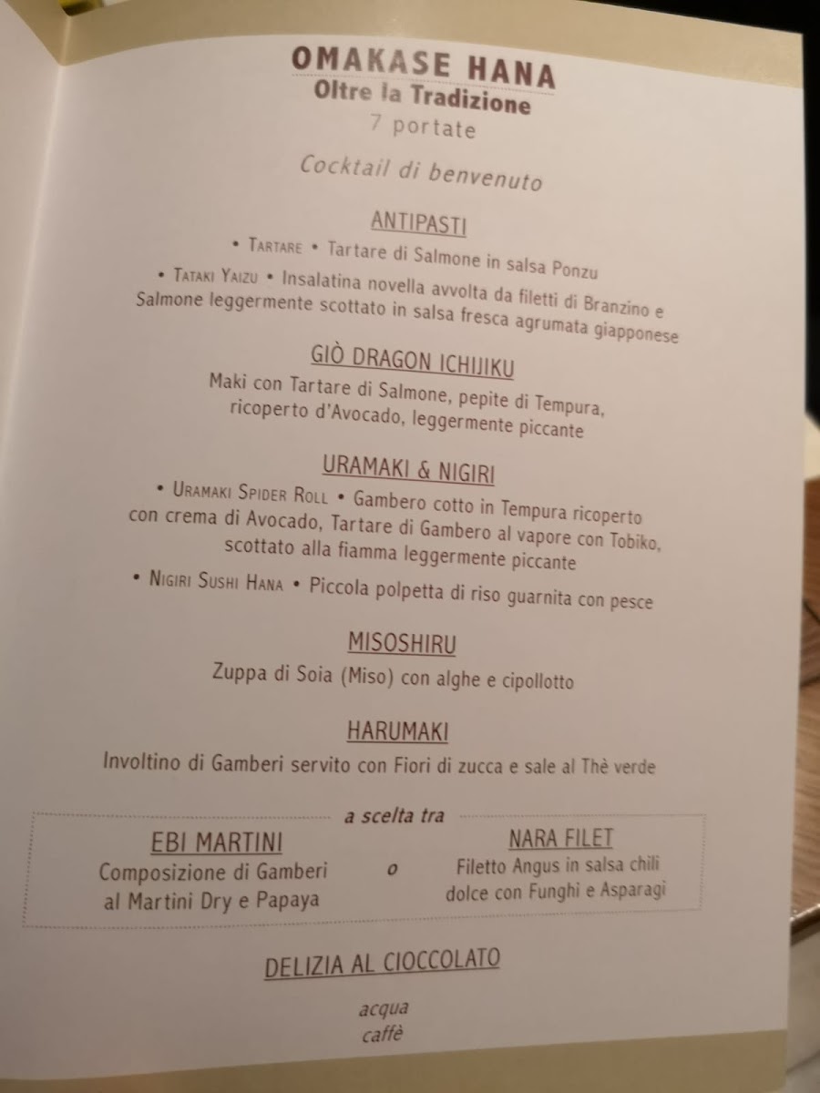 From a reviewer’s perspective, the menu at Hana Restaurant in Milan feels like a well-rounded culinary journey that balances Japanese tradition with contemporary appeal. The sushi selection is particularly impressive, ranging from refined nigiri and chirashi such as Nighiri Gambero Rosso Sicilia 2 Pz, Sushi 12 Pesce Bianco, Nighiri Salmone 10 Pezzi, and the visually striking BarachirashiGio' Dragon Ichijiku 1 Pezzo, all showcasing a clear focus on freshness and quality. The rolls section expands the experience with crowd-pleasing options like Uramaki Tonno E Avocado 8 Pz, Uramaki Salmone E Avocado 8 Pz, Uramaki Tonno Piccante 8 Pz, Crispy Roll 8 Pezzi, and simpler bites such as Hosomaki Avocado 6 Pz, making it suitable for both sushi purists and casual diners.