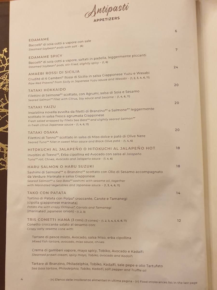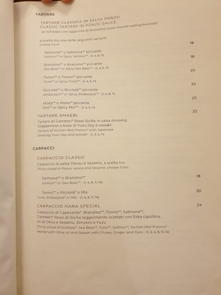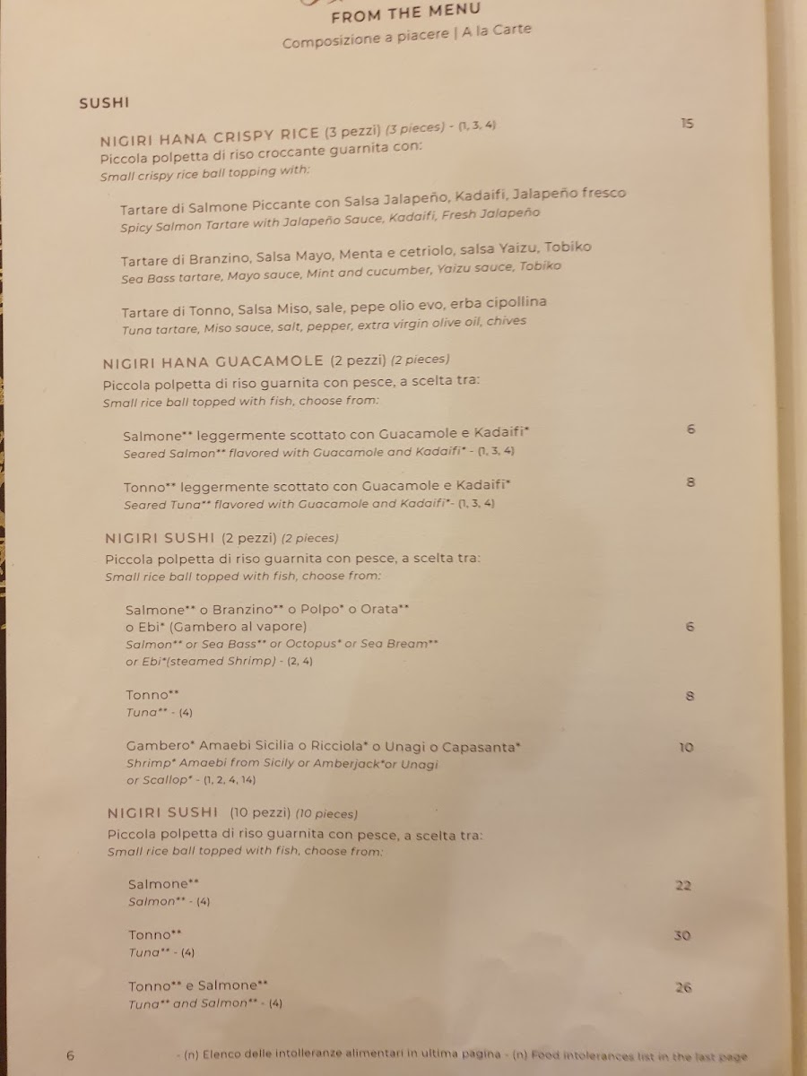 From a reviewer’s perspective, the menu at Hana Restaurant in Milan feels like a well-rounded culinary journey that balances Japanese tradition with contemporary appeal. The sushi selection is particularly impressive, ranging from refined nigiri and chirashi such as Nighiri Gambero Rosso Sicilia 2 Pz, Sushi 12 Pesce Bianco, Nighiri Salmone 10 Pezzi, and the visually striking BarachirashiGio' Dragon Ichijiku 1 Pezzo, all showcasing a clear focus on freshness and quality. The rolls section expands the experience with crowd-pleasing options like Uramaki Tonno E Avocado 8 Pz, Uramaki Salmone E Avocado 8 Pz, Uramaki Tonno Piccante 8 Pz, Crispy Roll 8 Pezzi, and simpler bites such as Hosomaki Avocado 6 Pz, making it suitable for both sushi purists and casual diners.